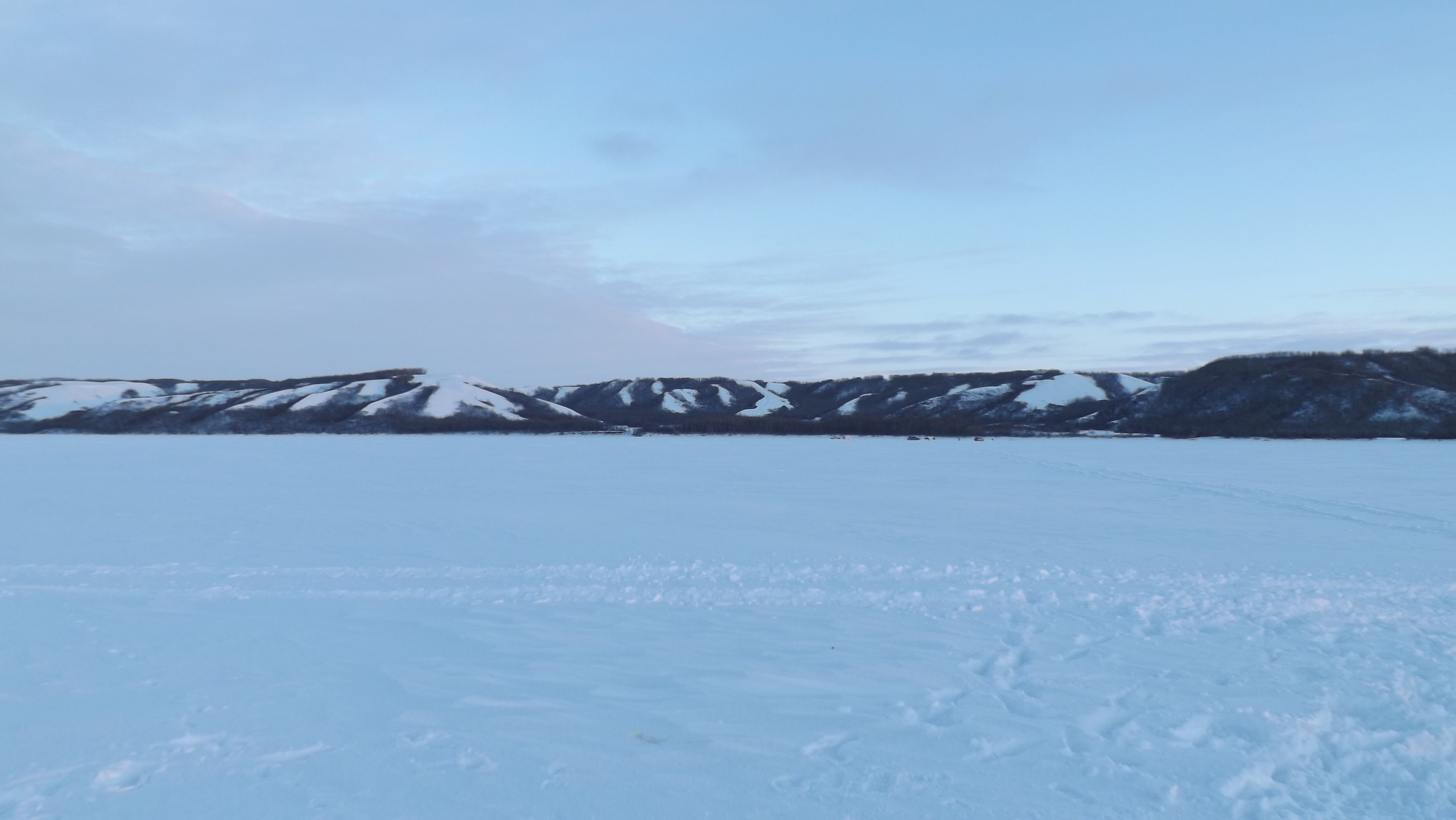At first glance, the two images above might seem kind of dull. Or at least thats what I thought when I first saw them on the camera after we left the valley and I was reviewing the photos I had taken. But after taking some time to re-examine these scenes, I fell into them and remembered why I took them. One reason was because of how deep the view was and how I thought these scenes gave an awesome sense of perspective. If you look closely at the second image (directly above) you can see tiny dark objects on the ice right before the tree line. These are other fishermen’s trucks and shacks way in the distance. The other reason I was attracted to these scenes, and wanted to capture them, was the faint hints of pink in the clouds. I thought, when you were able to see the dull pink, it made the pictures so much more beautiful.