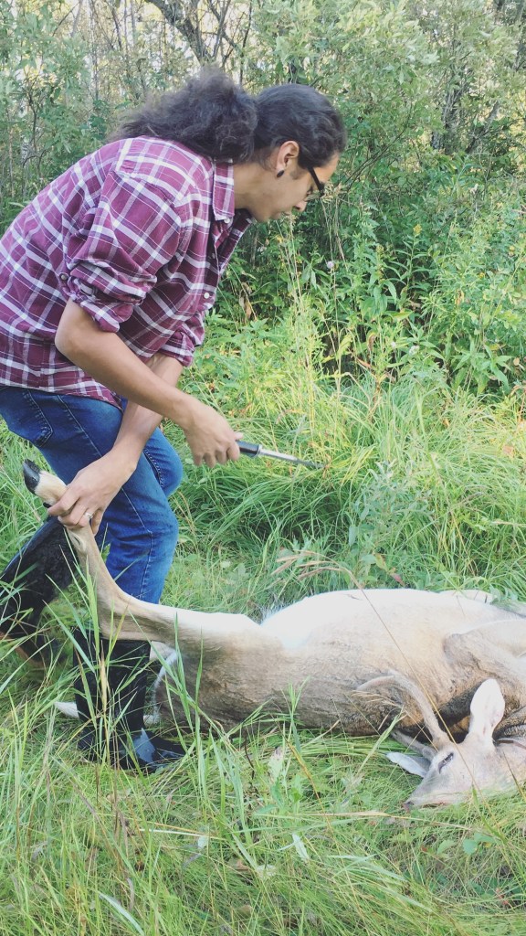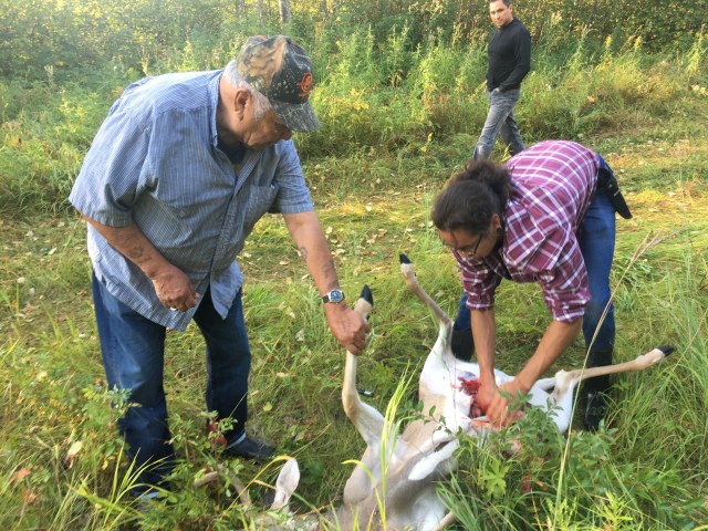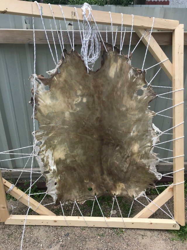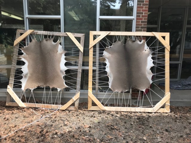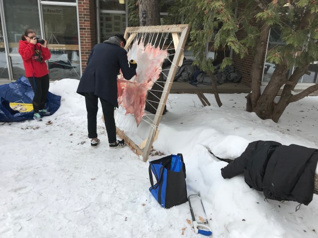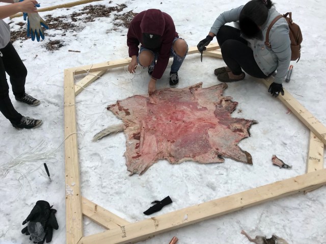 Once the animal is killed, tobacco is offered and a prayer is given. Then the animal is gutted quickly in the field to prevent bacteria growth and the meat spoiling. Then the animal is and skinned. Bellow is a gallery of the stretching and fleshing process done with students. Click on the images to read the captions and description of the process.